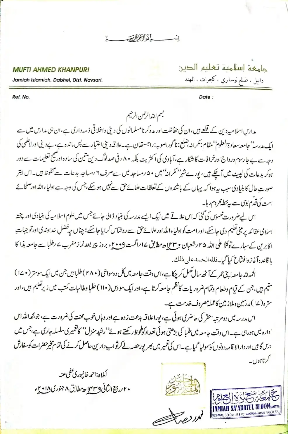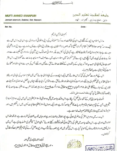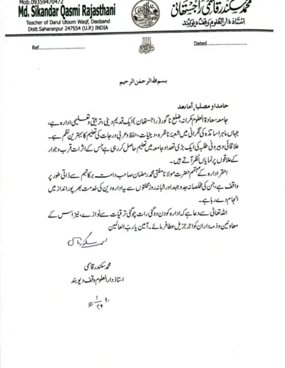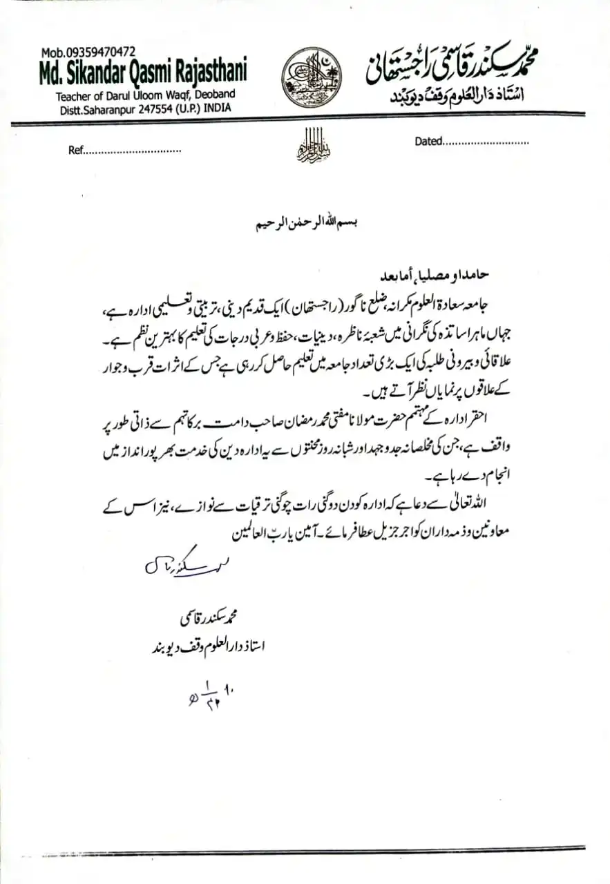 Jamiah Saadatul Uloom, located in Makrana, Rajasthan, was established on 25th Shaban 1430 A.H. (17th August 2009 A.D.) by Mufti Abdullah Sb. Mazahiri (D.B.). This institution, rooted in a region historically significant for its Islamic educational and spiritual contributions, started in a small mosque with seven local students and has grown to educate 200 boarding students, 150 maktab students, and 150 school students in Deeni education. The institution aims to revive Islamic teachings in an area that had seen a decline, combating anti-Islamic rituals and bidaah. Over its short history, it has developed substantial infrastructure and hosted visits from around 42 eminent Islamic scholars, contributing to its mission of spreading Islamic knowledge and guiding the Ummah.