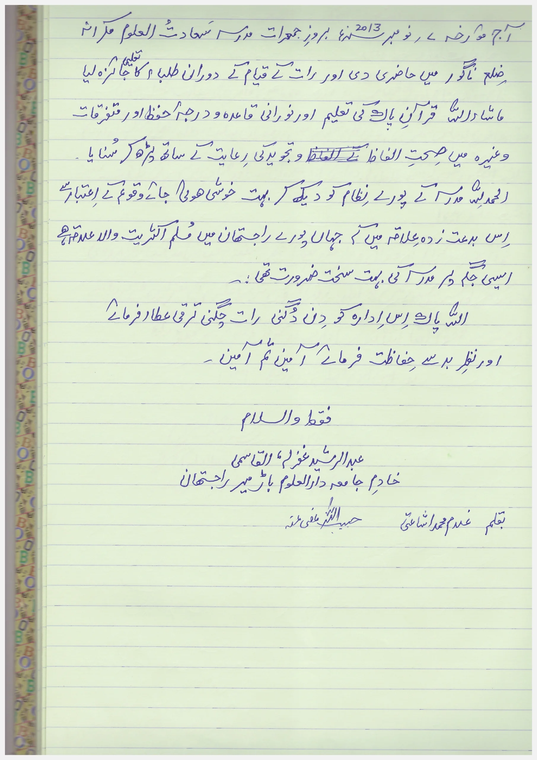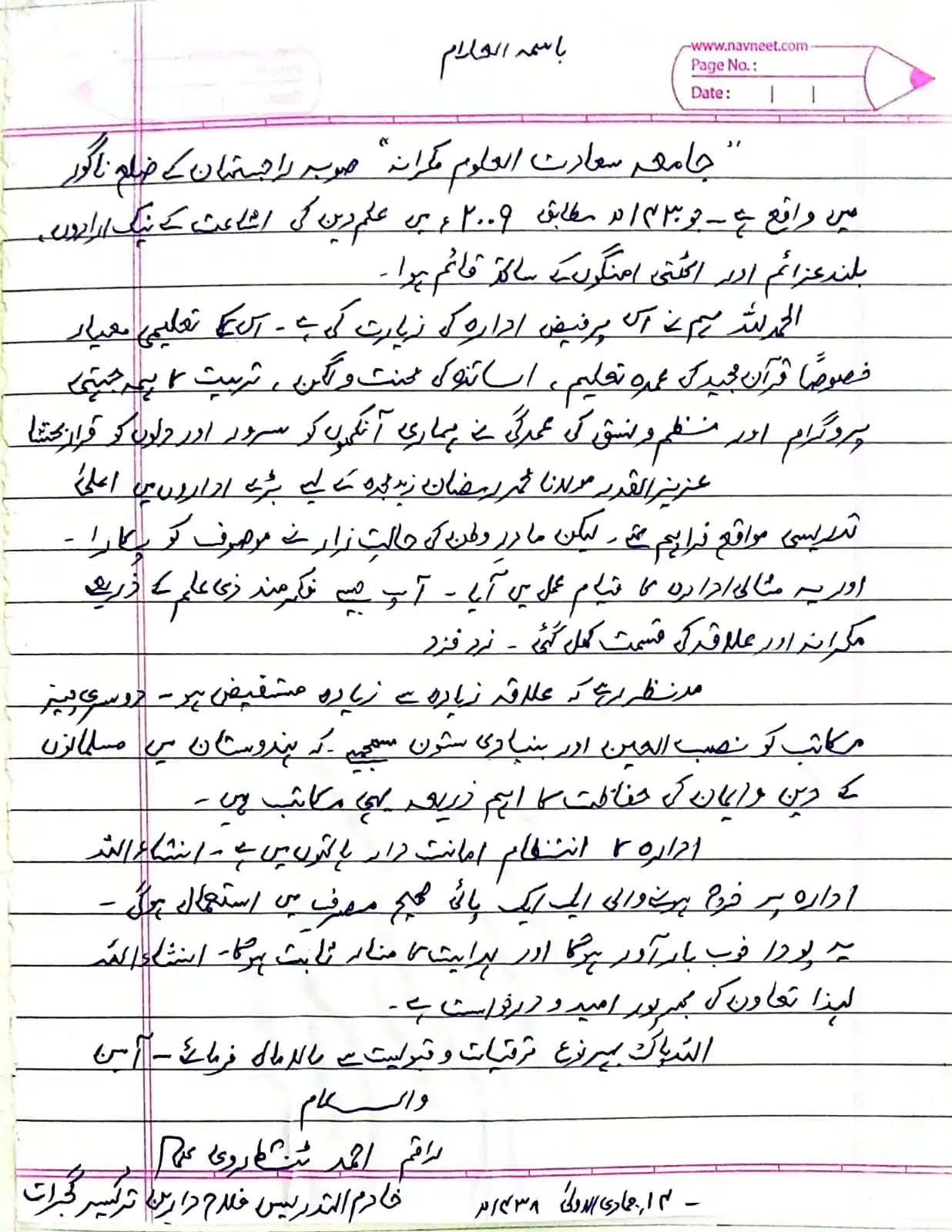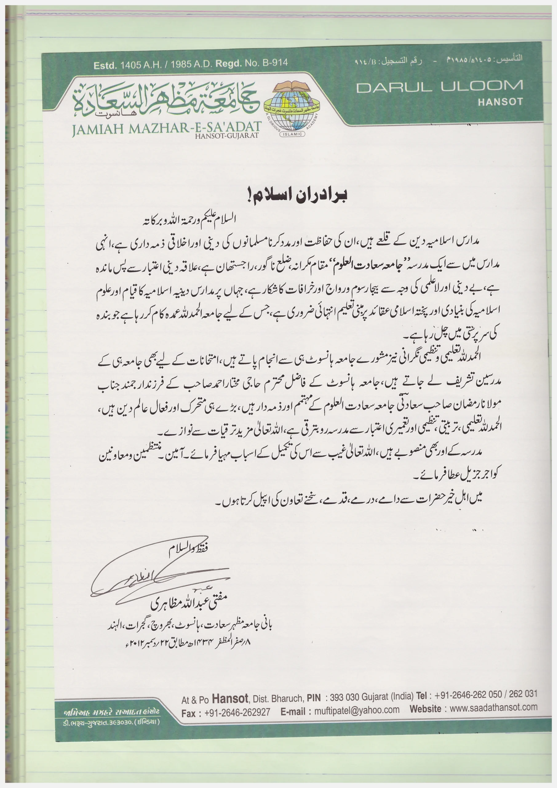 Jamiah Saadatul Uloom, located in Makrana, Rajasthan, was established on 25th Shaban 1430 A.H. (17th August 2009 A.D.) by Mufti Abdullah Sb. Mazahiri (D.B.). This institution, rooted in a region historically significant for its Islamic educational and spiritual contributions, started in a small mosque with seven local students and has grown to educate 200 boarding students, 150 maktab students, and 150 school students in Deeni education. The institution aims to revive Islamic teachings in an area that had seen a decline, combating anti-Islamic rituals and bidaah. Over its short history, it has developed substantial infrastructure and hosted visits from around 42 eminent Islamic scholars, contributing to its mission of spreading Islamic knowledge and guiding the Ummah.
